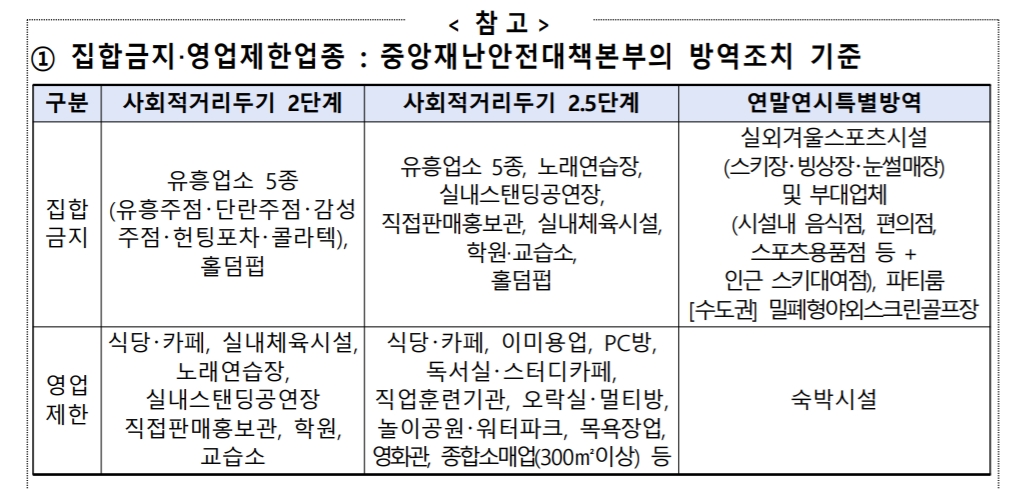 - 1월 11일부터 지원되는 집합금지·영업제한 업체들은 국세청과 지 자체로부터 명단을 받아 1차로 확정한 것입니다.