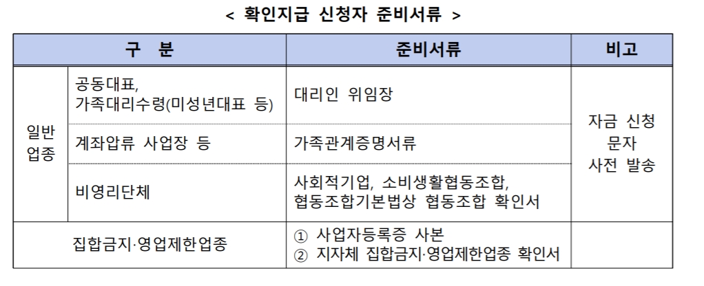 - 2월 1일부터는 소상공인이 직접 지자체로 부터 집합금지·영업제한 업종 확인서를 받아 신청할 수 있습니다.