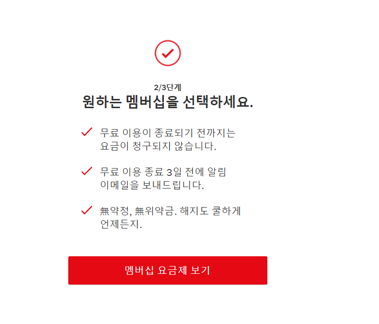 다음은 넷플릭스 멤버십 요금제에 대한 설명입니다. 무료이용이 종료되기전까는 요금이 청구되지 않으며, 종료 3일전에 이메일로 친절하게 메일도 보내줍니다. 약정도 없고 위약금도 없으니 이용을 원치 않으시면 무료 이용기간이 끝나고 해지를 하시면 됩니다. 멤버십 요금제 보기 버튼을 클릭해주시기 바랍니다.