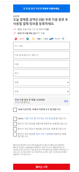 마지막으로 결제정보를 입력하면 됩니다. 무료 이용 종료 3일전에 알림 이메일을 보내주기 때문에 메일을 잘 확인 후 이용을 원치 않으시면 해지 신청을 하시기 바랍니다. 해지도 온라인으로 하시면 됩니다. 본인의 신용카드 및 체크카드를 입력하시기 바랍니다.