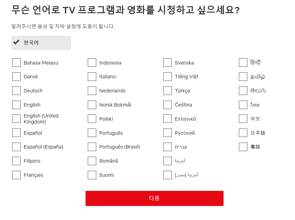 다음으로 원하는 언어 선택을 해주시면 됩니다. 해당 설정으로 음성 및 자막설정의 기초자료로 사용이 됩니다. 클릭 후 다음을 클릭해주시기 바랍니다. 중복 선택도 가능합니다.