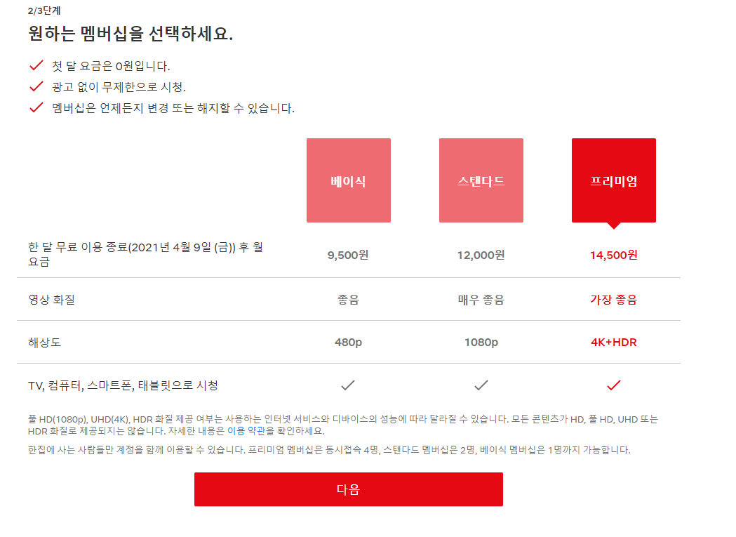 첫달은 무료이며, 광고 없이 무제한 시청이가능하고 멤버십 요금제는 언제든지 변경 및 해지가 가능합니다. 요금제는 베이식, 스탠다드, 프리미엄 3가지가 있습니다. 베이식 9,500원 스탠다드 12,000원 프리미엄 14,500원 입니다. 개인적으로 추천드리는 요금제는 프리미엄입니다. 그 이유는 베이식은 한개계정만 사용가능 멤버십은 두개 프리미엄은 4명까지 동시 접속이 가능하기 때문에 프리미엄으로 가입을 하고 1/4의 가격으로 지불을 하면 더욱더 저렴하게 이용이 가능하기 때문에 저는 프리미엄 요금제를 추천 드립니다.